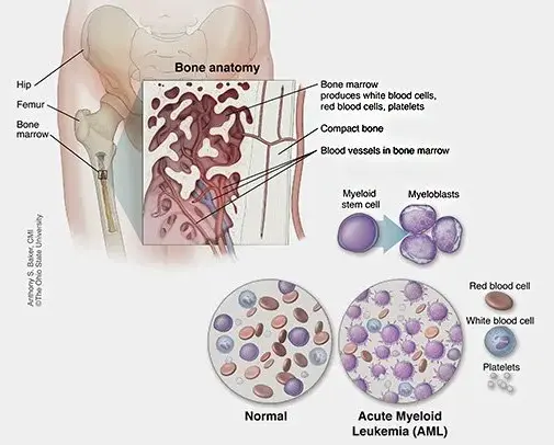 Acute myelogenous leukemia is a cancer of the blood and bone marrow. Bone marrow is the soft, spongy tissue inside bones where blood cells are produced. In this condition, the bone marrow makes abnormal cells that do not mature properly and interfere with the production of healthy blood cells.