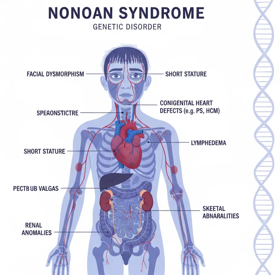Noonan syndrome is a genetic disorder that affects normal development in various parts of the body. It is characterized by distinctive facial features, short stature, heart defects, and other physical and developmental differences. Noonan syndrome can affect people of all genders and ethnic backgrounds and is often diagnosed in infancy or early childhood, though mild cases may be identified later …