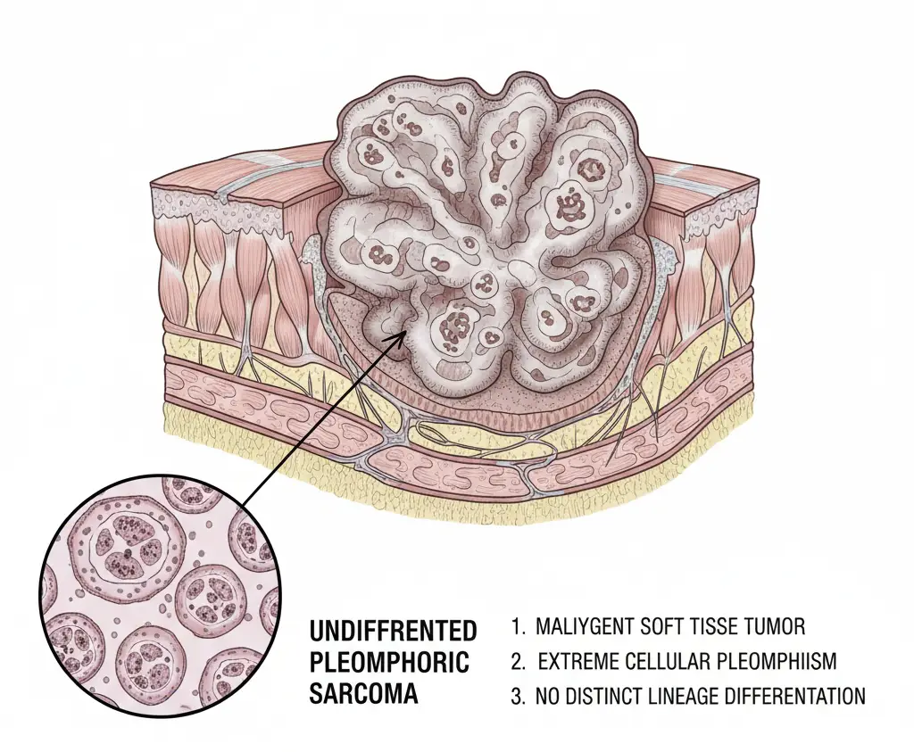 Undifferentiated pleomorphic sarcoma is a rare and aggressive type of soft tissue cancer that develops from connective tissues such as muscle, fat, fibrous tissue, or blood vessels. It was previously known as malignant fibrous histiocytoma. The tumor is called undifferentiated because the cancer cells do not resemble normal mature cells under a microscope, making the exact tissue of origin unclear. …