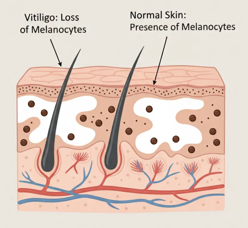 Vitiligo is a long-term skin condition in which patches of skin lose their normal pigmentation, resulting in white or light-colored areas. This occurs when the immune system mistakenly attacks the melanocytes, the cells responsible for producing skin pigment (melanin). Vitiligo can affect any part of the body, including the face, hands, arms, and genitals. The condition is not contagious, but …