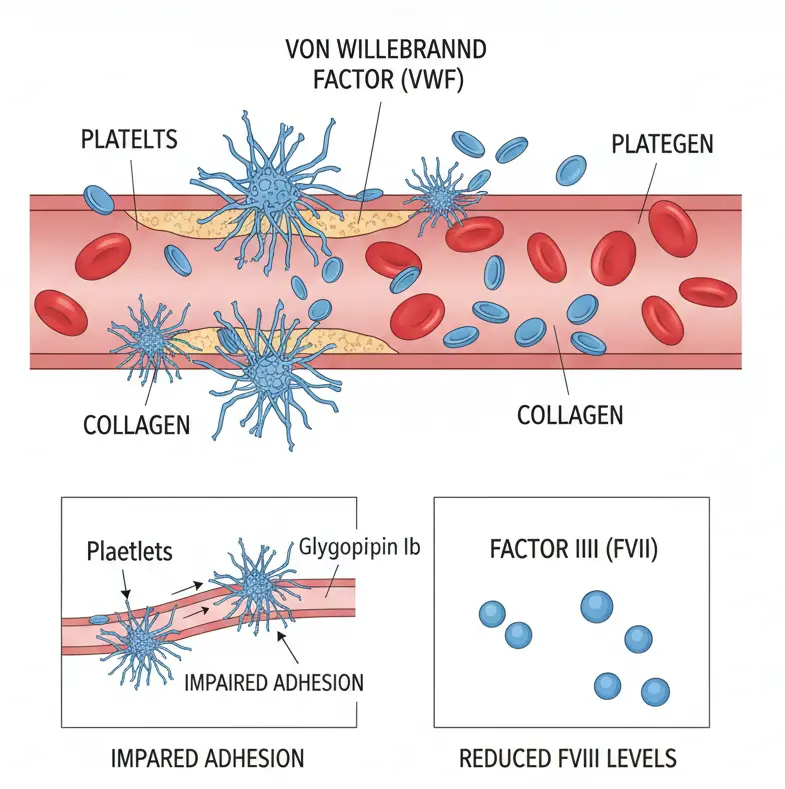 Von Willebrand disease (VWD) is a genetic bleeding disorder caused by a deficiency or dysfunction of von Willebrand factor, a protein essential for blood clotting. This protein helps platelets stick to damaged blood vessel walls and carries clotting factor VIII, which is necessary for forming stable blood clots. VWD is the most common inherited bleeding disorder and can range from …