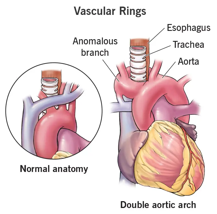 Vascular rings are rare congenital abnormalities of the aorta or its branches that form a ring around the trachea, esophagus, or both. This ring can compress the airway or food pipe, leading to breathing and swallowing difficulties. Vascular rings are present at birth, but symptoms may appear in infancy, childhood, or occasionally later in life. The severity of symptoms depends …