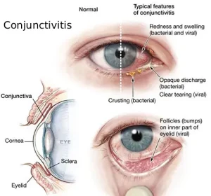 Conjunctivitis can be caused by several factors. Viral conjunctivitis is the most common and often associated with respiratory infections. Bacterial conjunctivitis results from bacterial infection of the eye. Allergic conjunctivitis occurs when the eyes react to allergens such as pollen, dust, or pet dander. Irritant conjunctivitis may develop from exposure to smoke, chemicals, or foreign bodies.