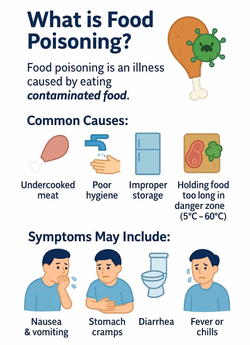 Food poisoning is an illness caused by consuming contaminated food or beverages. It occurs when harmful bacteria, viruses, parasites, or toxins enter the body through food. Symptoms often develop suddenly and can range from mild gastrointestinal discomfort to severe illness requiring medical care. Most cases resolve within a few days, but some may lead to serious complications, especially in vulnerable …