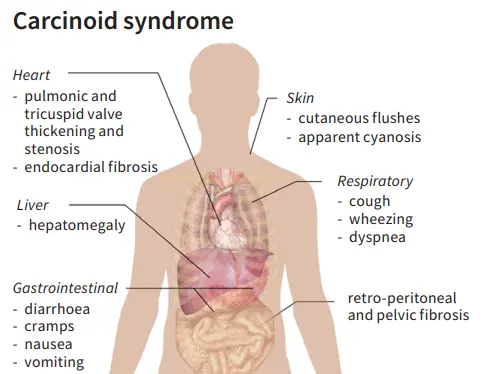Carcinoid syndrome is a group of symptoms that occur in some people with neuroendocrine tumors, most commonly carcinoid tumors that originate in the gastrointestinal tract or lungs. These tumors produce and release hormones and other chemical substances, such as serotonin, into the bloodstream. Carcinoid syndrome usually develops when these substances bypass normal liver breakdown, often due to tumor spread to …