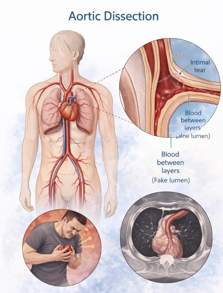 An aortic dissection is a life-threatening medical emergency that occurs when a tear develops in the inner layer of the aorta, the main artery that carries blood from the heart to the rest of the body. Blood flows rapidly through this tear, causing the inner and middle layers of the aortic wall to separate. This process is known as dissection. …