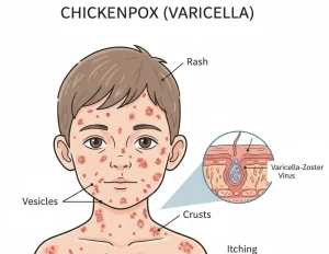 Chickenpox, also known as varicella, is a highly contagious viral infection caused by the varicella-zoster virus. It is most common in children but can affect people of any age who have not been vaccinated or previously infected. Chickenpox is characterized by an itchy skin rash with fluid-filled blisters and is usually mild in children, though it can be more severe in adults and individuals with weakened immune systems.