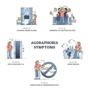 Agoraphobia symptoms center on fear and avoidance of specific situations. Common fears include: