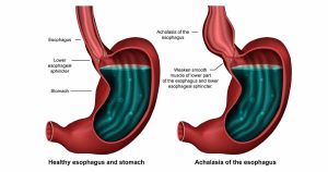 Achalasia is a rare disorder in which your esophagus is unable to move food and liquids down into your stomach. Your esophagus is the muscular tube that transports food from your mouth to your stomach. At the area where your esophagus meets your stomach is a ring of muscle called the lower esophageal sphincter (LES). This muscle relaxes (opens) to allow food to enter your stomach and contracts (tightens to close) to prevent stomach content from backing up into your esophagus. If you have achalasia, the LES doesn’t relax, which prevents food from moving into your stomach.