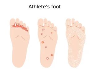 Athlete’s foot is a common fungal infection (caused by a fungus). Athlete’s foot causes an itchy, stinging, burning rash on the skin on one or both of your feet. Athlete’s foot is most common between your toes, but it can also affect the tops of your feet, the soles of your feet and your heels. Your skin may become scaly and cracked or develop blisters. Sometimes, your feet smell bad.