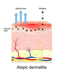 Atopic dermatitis is linked to a combination of genetic, immune, and environmental factors. In some individuals, a gene variation affects the skin’s ability to act as a protective barrier. When this barrier is weak, the skin loses moisture easily and becomes more vulnerable to irritants, allergens, bacteria, and environmental factors such as tobacco smoke.