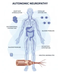 Autonomic neuropathy occurs when the nerves that control automatic body functions are damaged. This can affect blood pressure, temperature regulation, digestion, bladder function, and sexual function.