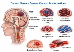 Central nervous system (CNS) vascular malformations are abnormal clusters of blood vessels in the brain or spinal cord. These malformations can disrupt normal blood flow and may lead to neurological symptoms or complications such as bleeding. CNS vascular malformations include several types, such as arteriovenous malformations (AVMs), cavernous malformations, capillary telangiectasias, and venous malformations. Some are present at birth, while others develop later in life. Early detection is important to manage symptoms and reduce the risk of serious complications.