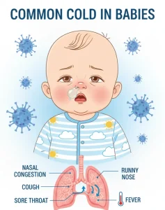 The common cold in babies is a mild viral infection of the upper respiratory tract, affecting the nose, throat, and sometimes the airways. It is caused by viruses such as rhinoviruses and is highly contagious.