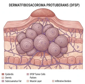 Dermatofibrosarcoma Protuberans is a rare, slow-growing soft tissue cancer that originates in the deep layers of the skin, particularly the dermis and subcutaneous tissue. It typically presents as a firm skin lesion that gradually enlarges over time. Although it grows slowly and rarely spreads to distant organs, it has a high tendency to recur locally if not treated adequately.