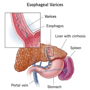 Esophageal varices are enlarged, swollen veins in the lower part of the esophagus. They develop when normal blood flow to the liver is blocked, most often due to chronic liver disease, causing blood to be redirected into smaller veins that are not designed to handle high pressure. These veins can become fragile and prone to bleeding, making esophageal varices a serious and potentially life-threatening condition.