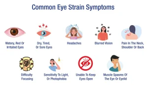 Symptoms of eyestrain can vary in intensity and may worsen with continued eye use. Common symptoms include: