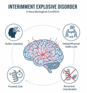 Intermittent explosive disorder (IED) is a mental health condition characterized by recurrent, sudden episodes of impulsive and aggressive behavior that are disproportionate to the situation. These outbursts may involve verbal aggression, physical violence, or destruction of property. The episodes are typically brief but can cause significant distress, relationship problems, and legal or occupational consequences.