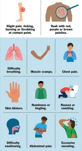 Symptoms of jellyfish stings can appear immediately or shortly after contact and may range from mild to severe: