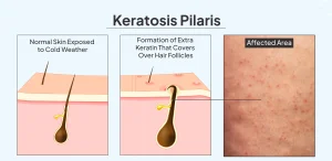 Keratosis pilaris develops when excess keratin accumulates in hair follicles. Keratin is a hard protein found in the outer layer of skin that serves as protection against harmful substances and infection. In people with keratosis pilaris, this protein builds up and forms a plug that blocks the opening of hair follicles, creating the characteristic small bumps.