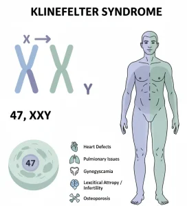 Klinefelter syndrome is a genetic condition that affects males and occurs when an individual is born with one or more extra X chromosomes, most commonly 47,XXY instead of the typical 46,XY. The condition can affect physical development, hormone levels, and fertility. Many individuals with Klinefelter syndrome are not diagnosed until adolescence or adulthood due to mild or subtle symptoms.