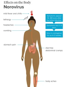 Symptoms of norovirus infection typically appear 12 to 48 hours after exposure and may include: