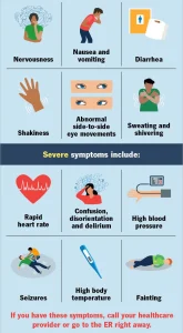 • Autonomic symptoms such as fever, sweating, rapid heart rate, high blood pressure, dilated pupils, nausea, or diarrhea