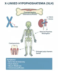 X-Linked Hypophosphatemia, commonly known as XLH, is a rare inherited disorder that affects bone and tooth development. It is caused by abnormal regulation of phosphate in the body, leading to chronically low levels of phosphate in the blood. Phosphate is essential for strong bones and teeth, and long-term deficiency results in impaired bone mineralization.