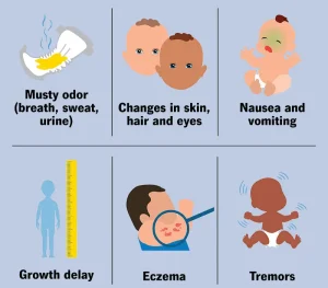 Symptoms of phenylketonuria may not be noticeable in newborns at first but can develop as phenylalanine levels increase in the body.