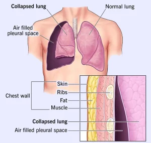 Pneumothorax is a condition in which air leaks into the space between the lung and the chest wall. This space, known as the pleural space, normally contains only a small amount of fluid that allows the lungs to move smoothly during breathing. When air enters this space, it can cause the lung to collapse partially or completely.