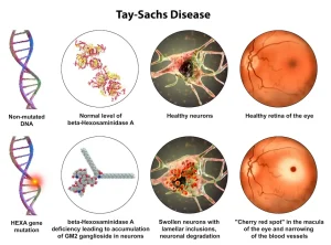 Tay-Sachs disease is a rare, inherited neurological disorder that progressively destroys nerve cells in the brain and spinal cord. It is caused by the absence or severe deficiency of an enzyme needed to break down a fatty substance in nerve cells. As this substance accumulates, it leads to worsening neurological damage.