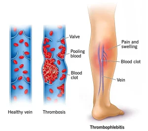 Thrombophlebitis occurs when a blood clot forms in a vein and triggers inflammation. The clot may develop due to slowed blood flow, injury to the vein, or conditions that increase the blood’s tendency to clot.